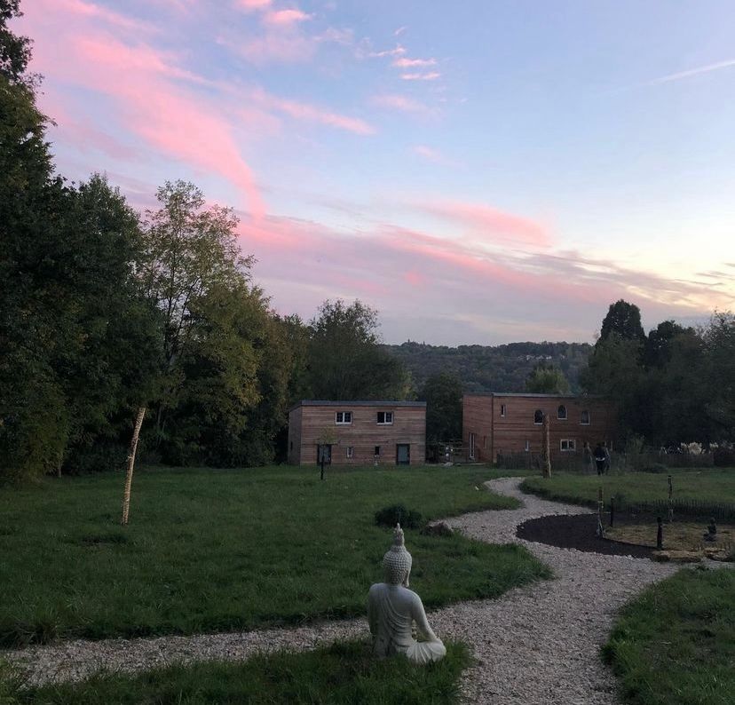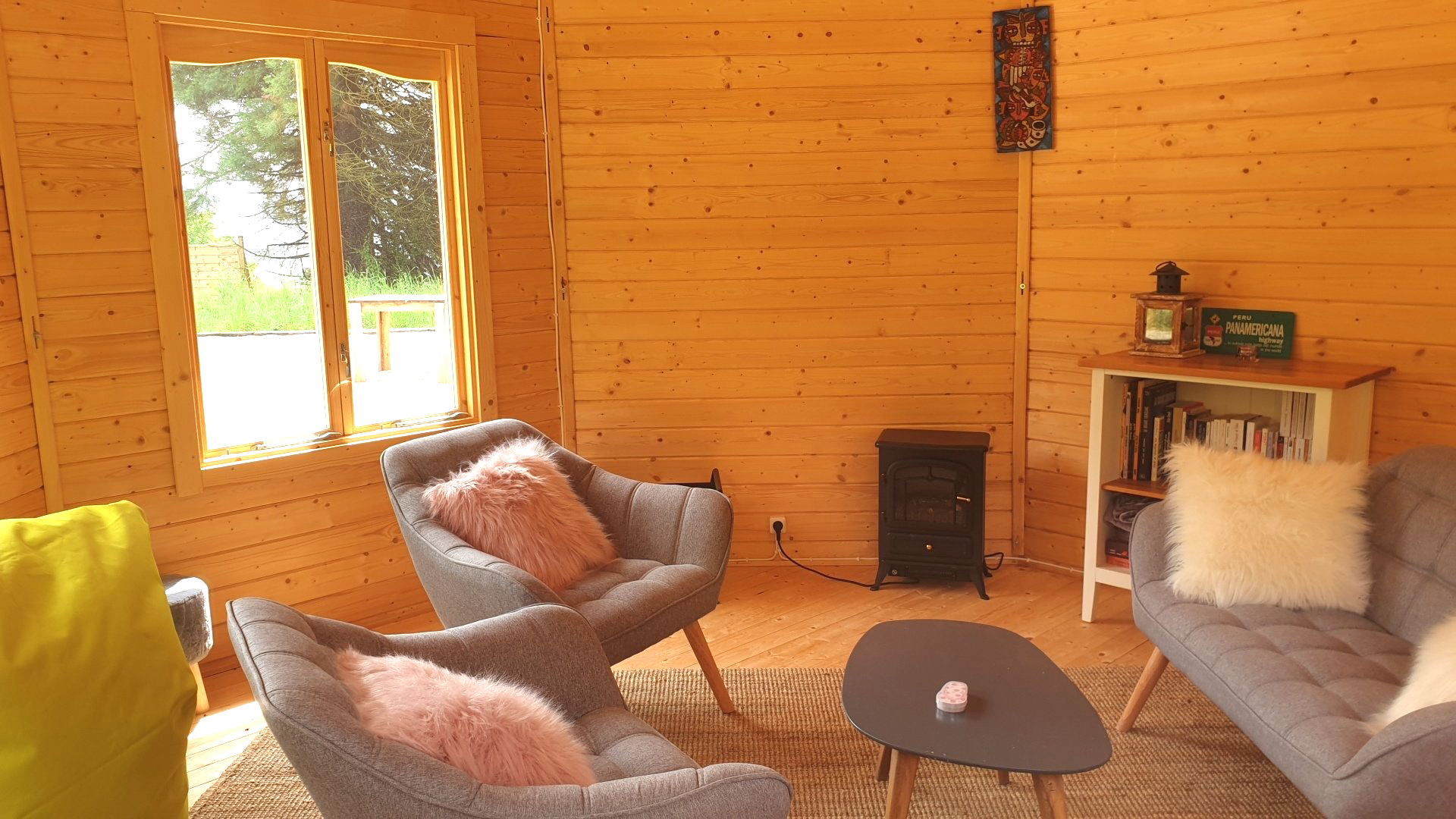 Killawasi : en étage du gîte de 4 personnes, dans une maison en bois toute récemment construite, vous trouverez une chaleureuse salle de pratique, avec de large fenêtres donnant sur la Vallée et le jardin.