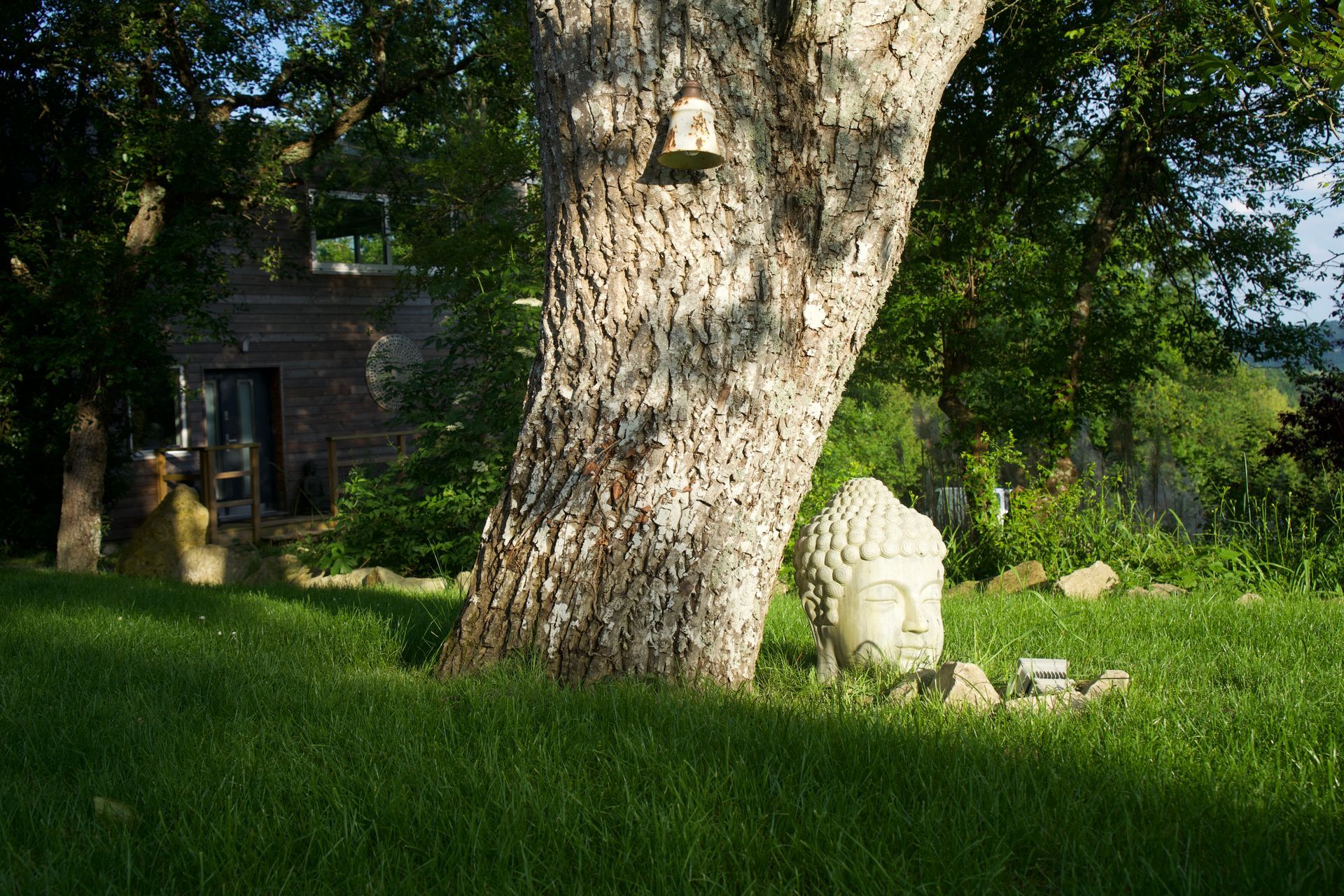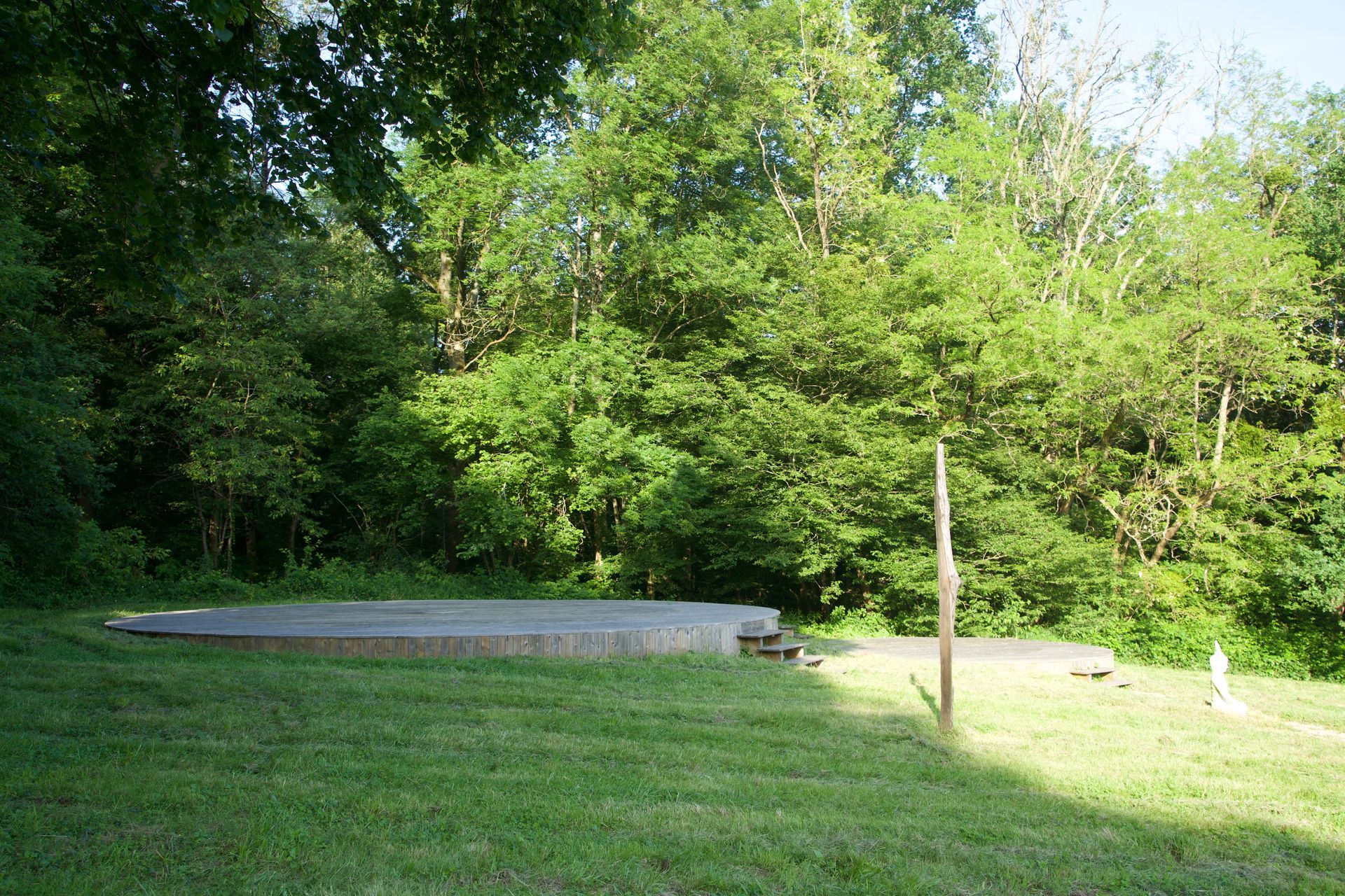 Deux grandes plateformes en bois dans le jardin près arbres fruitiers, pour vos pratiques de yoga, ou même pour vous y marier !